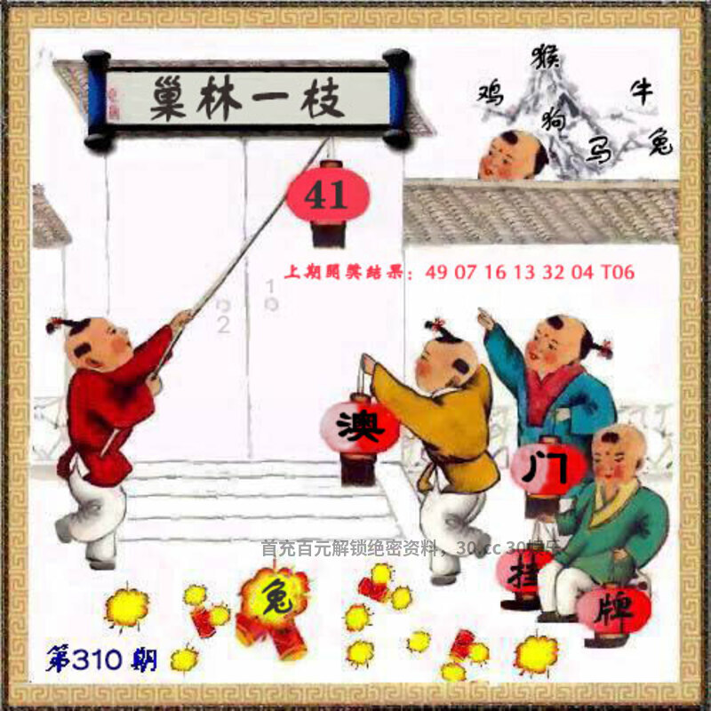 310期挂牌《巢林一枝》 解:原指鹪鹩筑巢仅需占用一根树枝,后引申为比喻人安守本分,不贪求多余之物 解:比喻人安守本分,不贪求多余之物解猪狗猴牛虎羊,挂:41:兔 七肖:兔牛猪狗猴虎羊 |